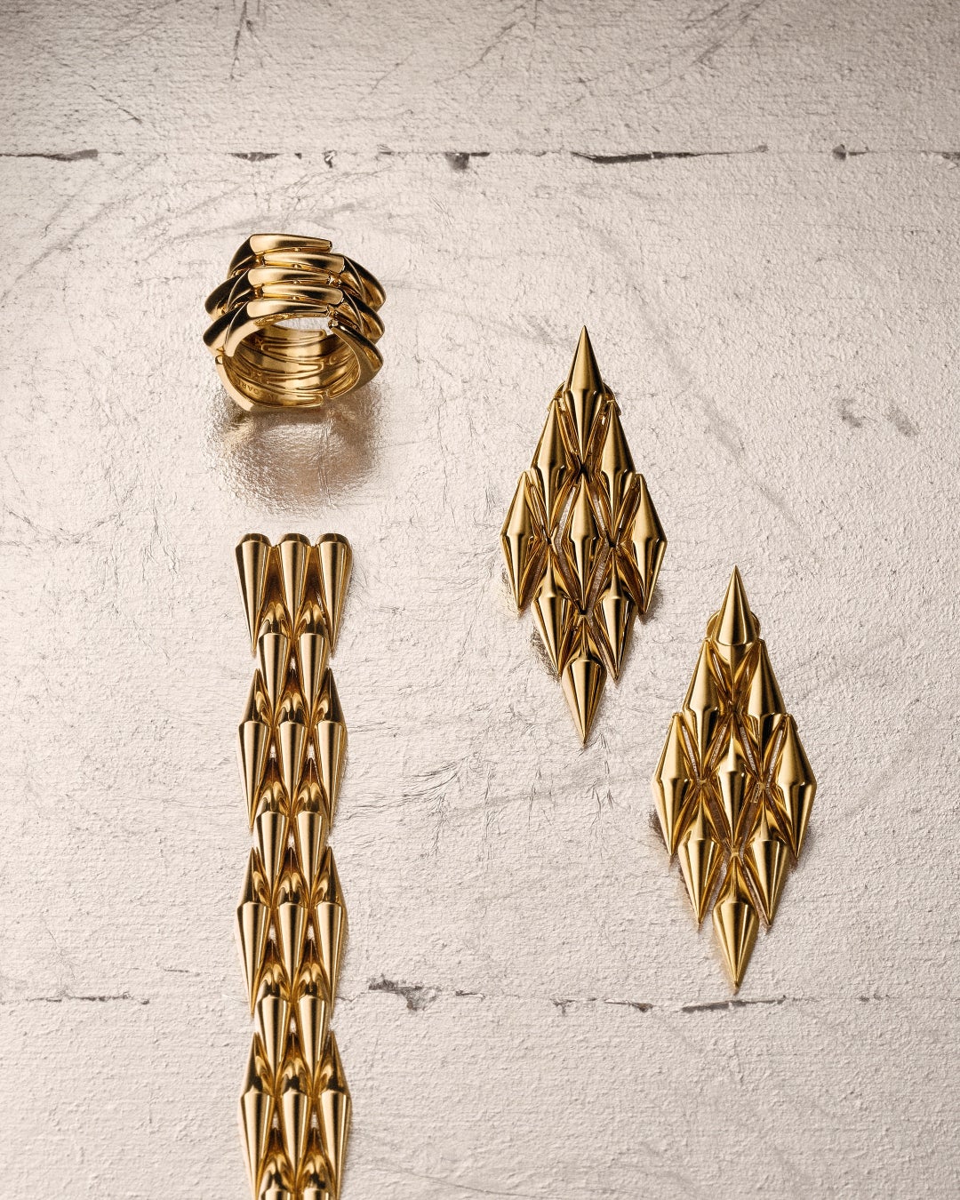 「このラインを構想する際、私はオリジナルのアーカイブ作品が持つ時代を超えた魅力に心を奪われ、常にその存在を念頭に置いていました。そのリズミカルな幾何学模様と温かみのあるゴールドの色調に魅了され、現代的な感性で再解釈しました。どの作品も流れるようで触覚的な魅力があり、身体に自然に沿うようにデザインされています。コンテンポラリーでエレガント、そして私たちのヘリテージに深く結びついています」