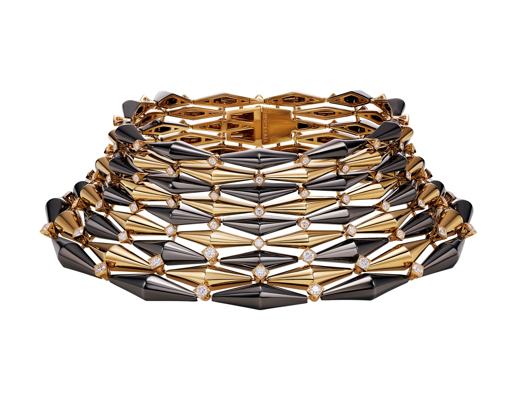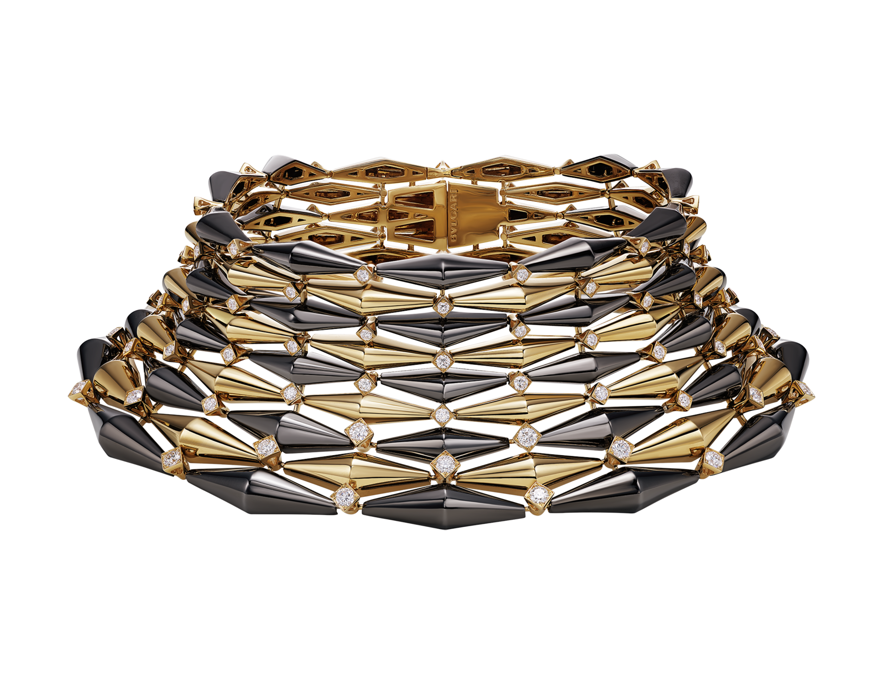 輝くイエローゴールド、大胆なブラックのダイヤモンド・ライク・カーボン(DLC)、そして正方形にカットされたダイヤモンドパヴェが織りなす革新的な要素が織りなす、独創的な美しさは、身につける人にモダンな質感を提供します。横に広がるデザインから縦に流れるデザインまで多様に制作されたネックレスには、チョーカー、クラシックなネックレス、そしてアバンギャルドなポンチョスタイルのデザインが含まれます。