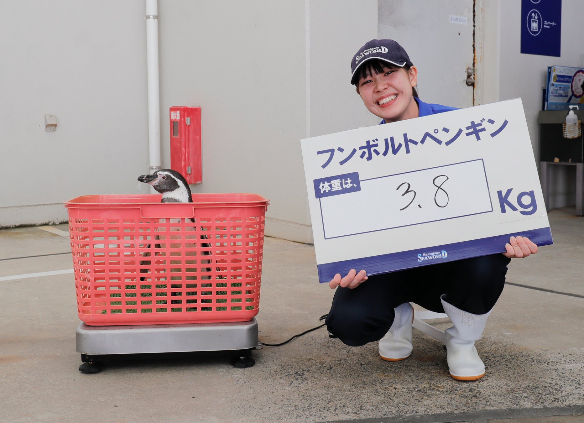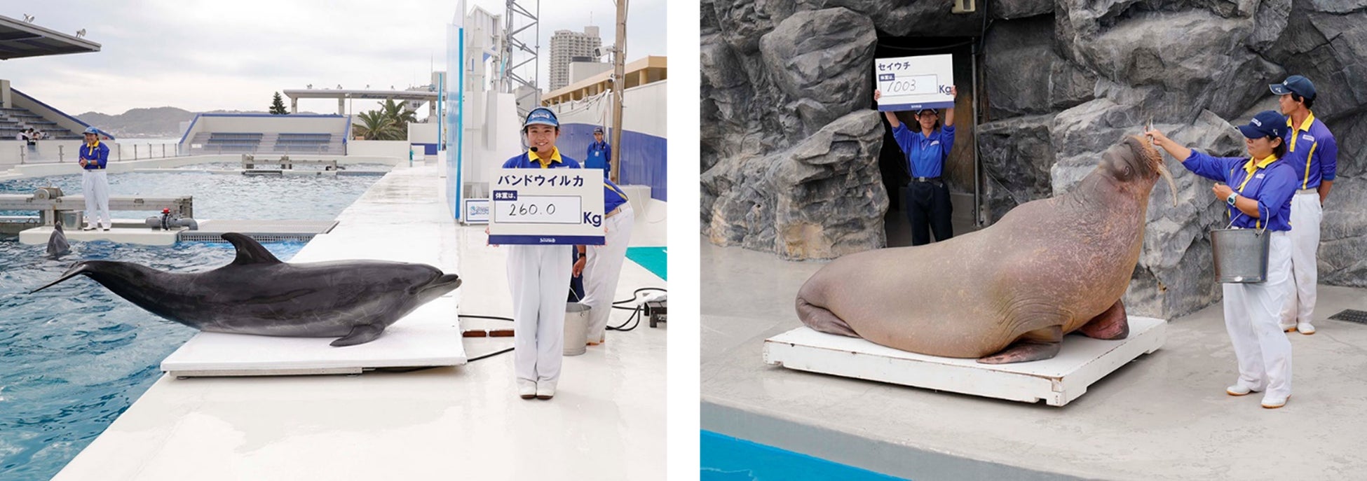 動物ごとに体重の測定方法は異なり、それぞれの体の大きさやトレーニング状況にあわせた計測を行っています。体が大きく飼育員が持ち上げることが難しいバンドウイルカやセイウチは、ハンドサインで特製の体重計に誘導し、自ら体重計に乗ってもらうことでスムーズな計測を行います。反対にフンボルトペンギンは、カゴやバケツなどの中に入れ、人間が使用する体重計に近しい測定器を用います。手の平サイズなアカウミガメの赤ちゃんは、キッチンで使用する計量器などを用います。飼育員は、それぞれの動物たちの特徴や状況に応じて負担の少ない計測方法を選択します。