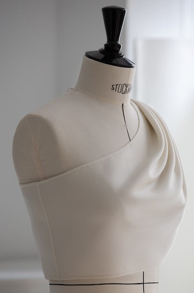 スハイラ・ヤコブは、2024-2025秋冬 オートクチュール コレクションからエクリュウール素材のドレープトップとラップスカートのアンサンブルを纏い、グラディエーターブーツを合わせ登場しました。白いウールとシルク製のドレープトップの側面には、ブラックレザーのストラップが付けられています。スカートも同様にホワイトウールとシルクのスカートがショーツを覆う形で、ブラックレザーのベルトが取り付けられています。トップには300時間、スカートには200時間の製作時間が費やされています。