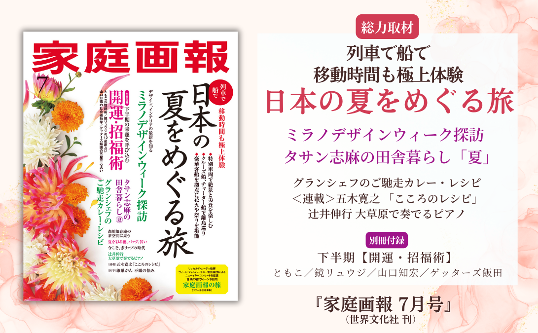 《新しい旅スタイルを提案》列車で船で「日本の夏をめぐる旅」/ミラノデザインウィーク探訪/<連載>タサン志麻/<別冊付録>開運・招福術ほか『家庭画報 7月号』5月31日発売