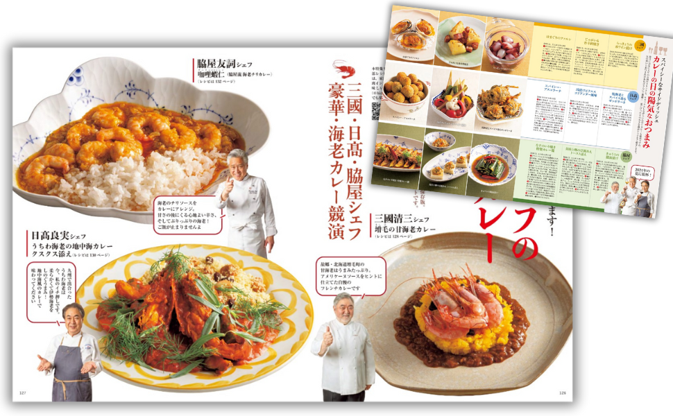 暑い夏のご馳走といえば「カレー」ですが、そのスタイルは作り手によって十人十色。今回は日本を代表する3名のグランシェフである三國清三シェフ、日髙良実シェフ、脇屋友詞シェフに、秘伝の技と隠し味をピリッときかせたオリジナルのカレーレシピを教えていただきました。”海老”が主役のご馳走カレーの競演。そして、盛夏のおもてなしカレーやまかないカレーの特別公開、カレーの日のスパイシーなおつまみと盛りだくさん。「2人には負けられないぞ!」とそれぞれのシェフが心を込めて生み出した、バラエティ豊かなレシピは永久保存版です。