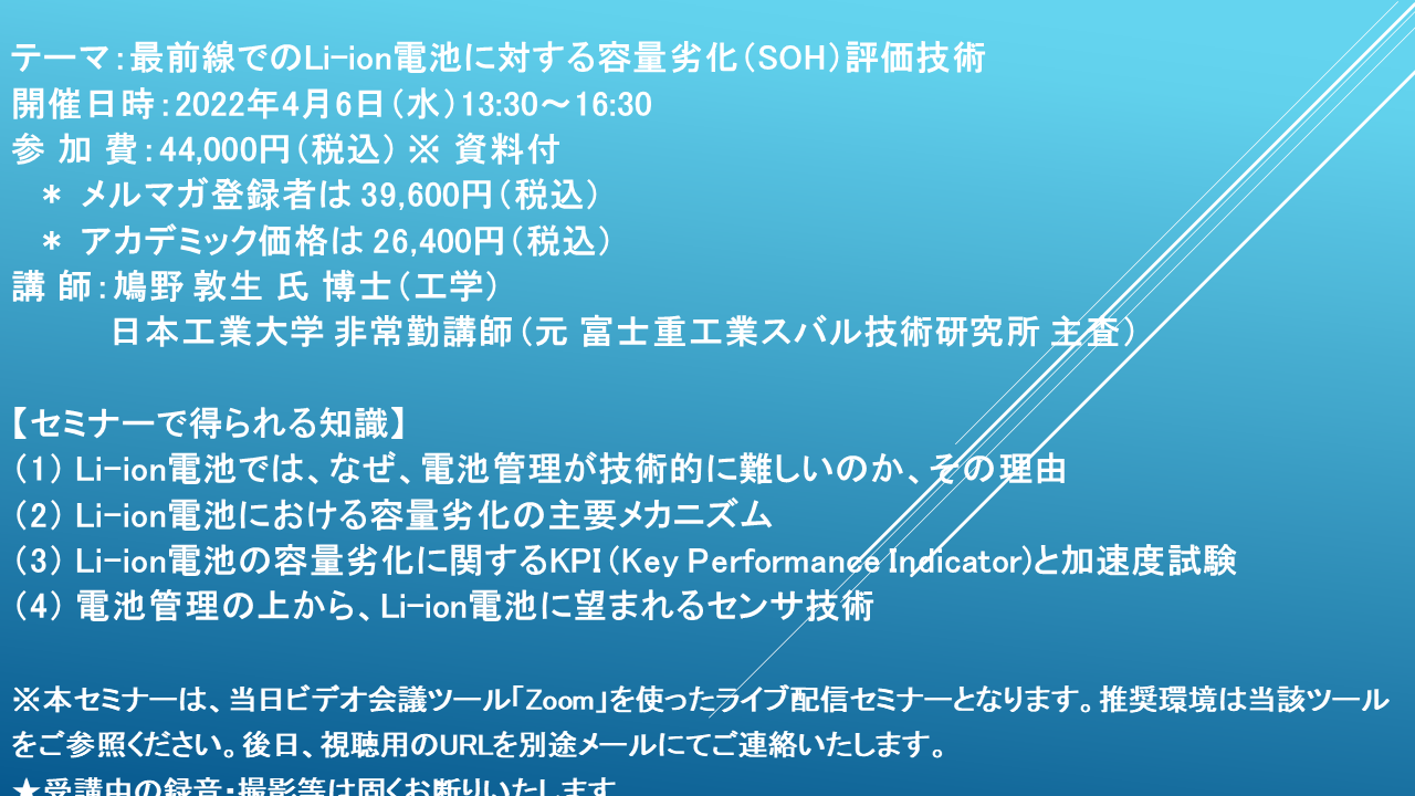 先端技術情報や市場情報を提供している(株)シーエムシー・リサーチ(千代田区神田錦町: https://cmcre.com/ )では、 各種材料・化学品などの市場動向・技術動向のセミナーや書籍発行を行っておりますが、 このたび「最前線でのLi-ion電池に対する容量劣化(SOH)評価技術」と題するセミナーを、 講師に鳩野 敦生 氏 博士(工学) 日本工業大学 非常勤講師 (元 富士重工業スバル技術研究所 主査))をお迎えし、2022年4月6日(水)13:30より、 ZOOMを利用したライブ配信で開催いたします。 受講料は、 一般:44,000円(税込)、 弊社メルマガ会員:39,600円(税込)、 アカデミック価格は26,400円(税込)となっております(資料付)。