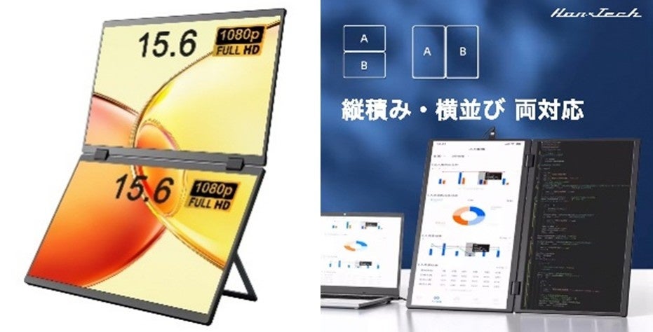 15.6インチ×2画面搭載の折りたたみ式モバイルデュアルモニター。高精細IPSパネルでFHD表示、横長・縦長どちらにも対応。360度回転で自由な視野を確保し、アルミ合金製でわずか1.6kgの軽量設計。マルチデバイス対応で、外出先でも快適な作業環境を実現します。