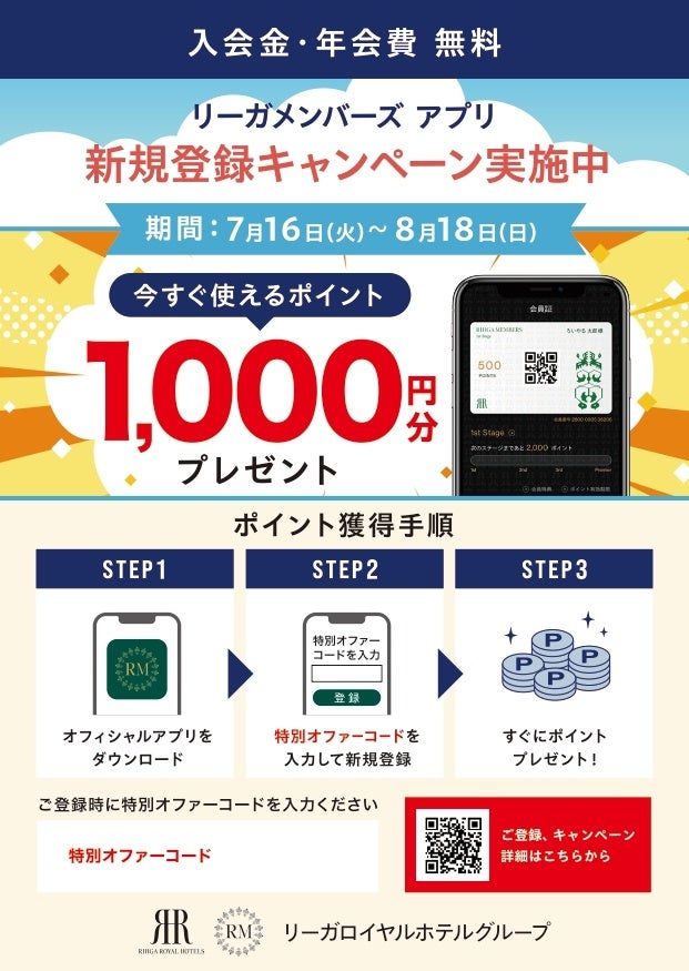 全国にリーガロイヤルホテルグループ&アソシエイトホテルズを展開する株式会社ロイヤルホテル(大阪市北区中之島、代表取締役社長 植田 文一)は、会員サービス「リーガメンバーズ」のスマートフォン向けアプリにおいて、7月16日(火)から8月18日(日)まで、 今すぐ使えるポイント1,000円分をプレゼントする新規登録キャンペーンを実施します。また、新たに会員登録された方全員に、すぐに使えるお得なクーポンをプレゼントします。
