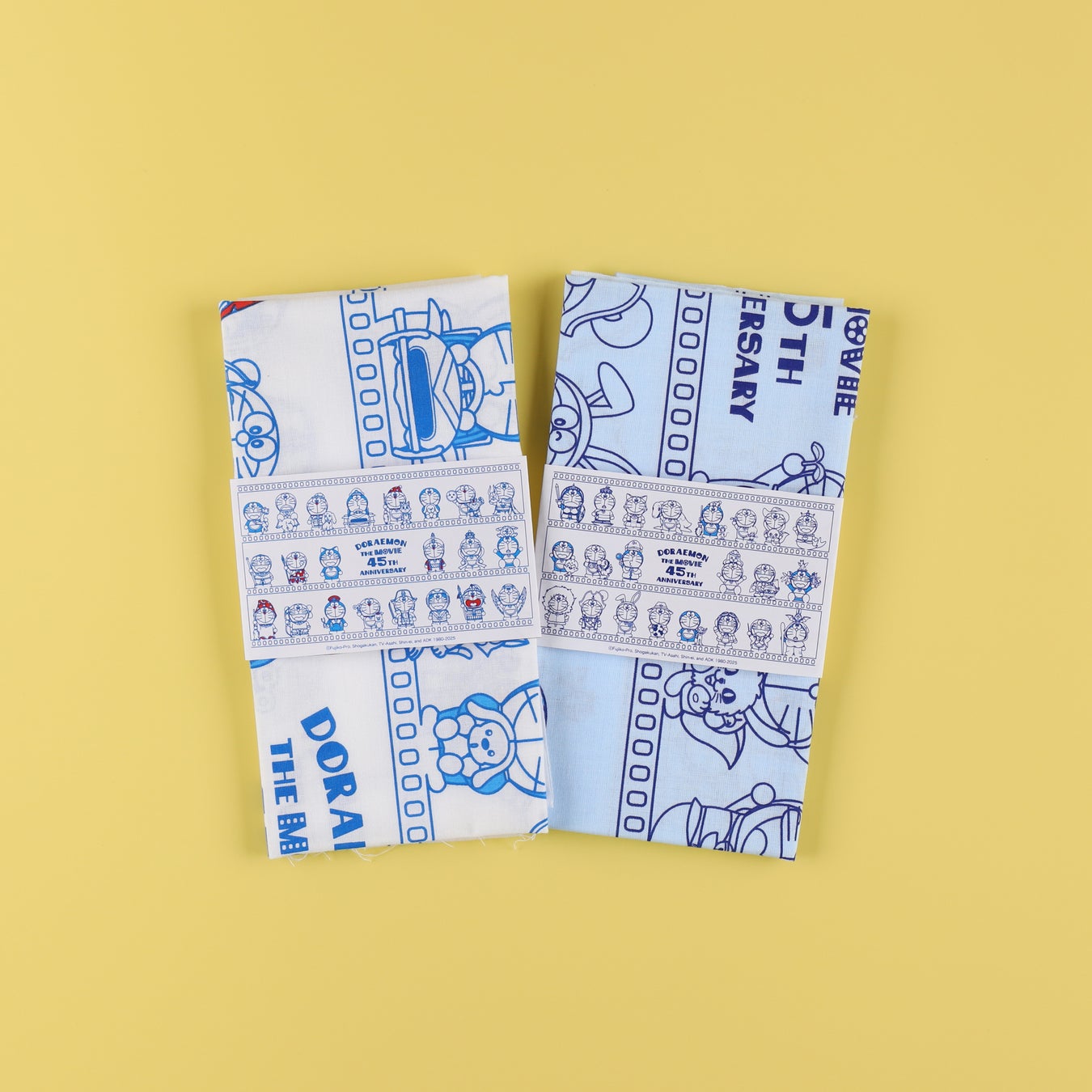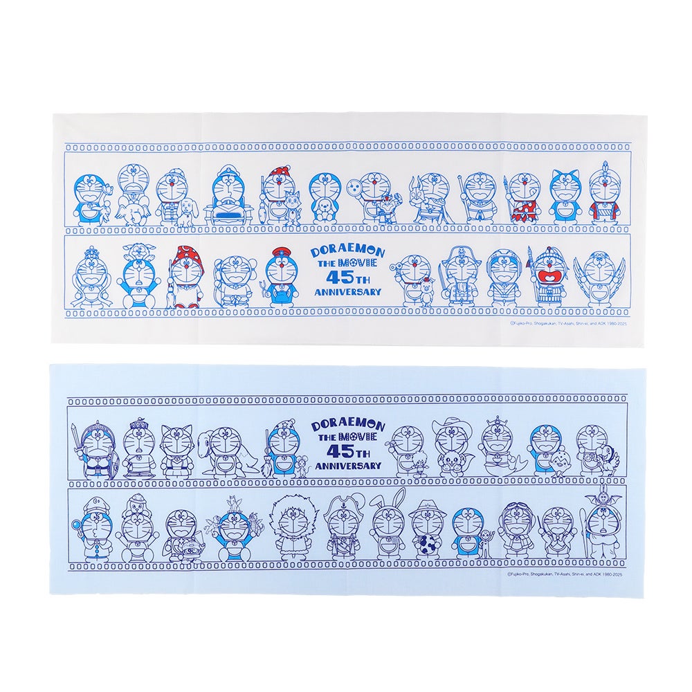 映画ドラえもんの45周年を記念した手ぬぐいです。2枚セットで、2つ合わせると歴代の映画作品のドラえもんが勢ぞろいするデザインです。ご自宅用だけでなくギフトとしての購入や、家族・友人と分けての使用もできるアイテムです。