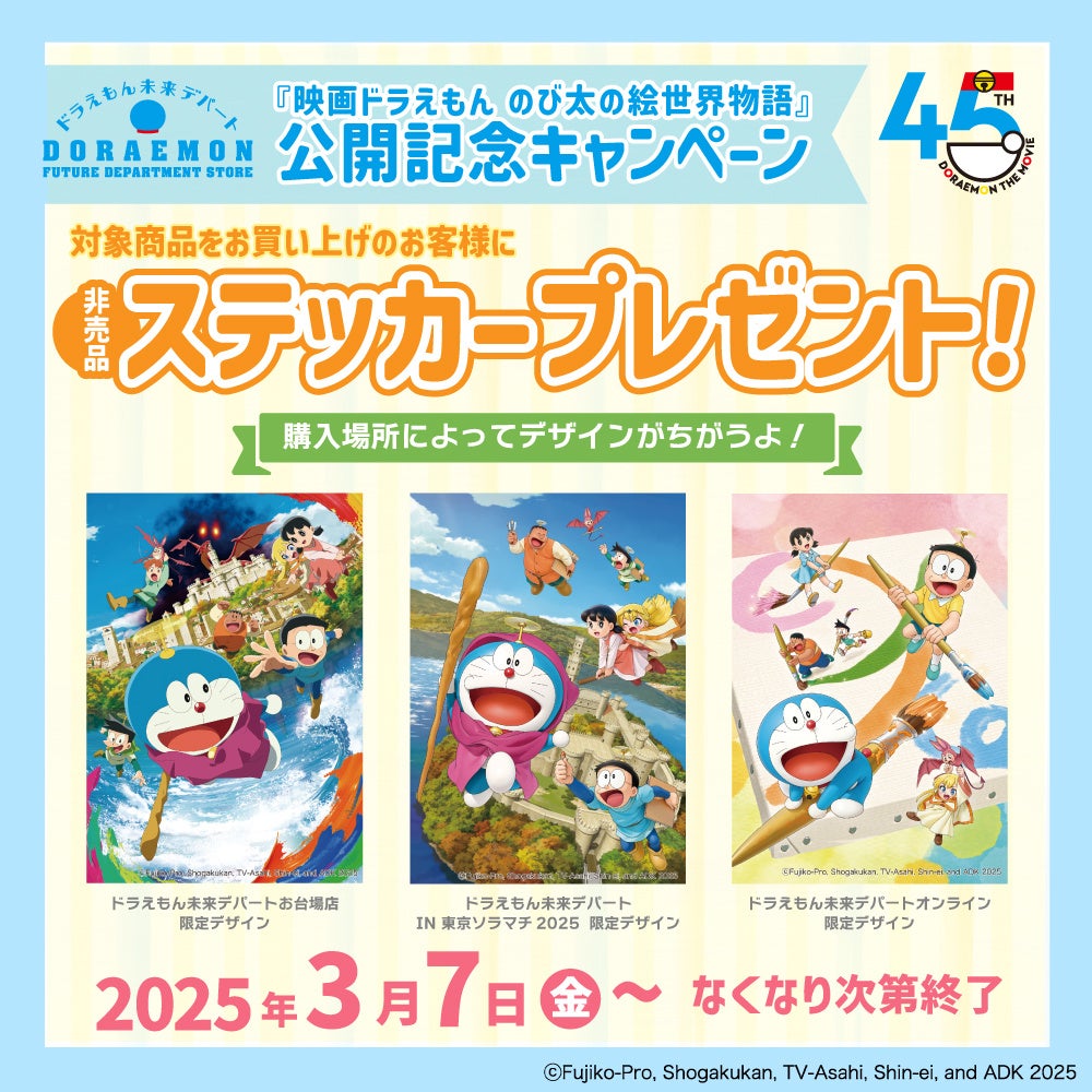 また新作映画の公開を記念して、ドラえもん未来デパート全店で対象商品をお買い上げのお客様に、店舗によって柄が異なるステッカー(非売品)をプレゼントするキャンペーンを実施いたします。