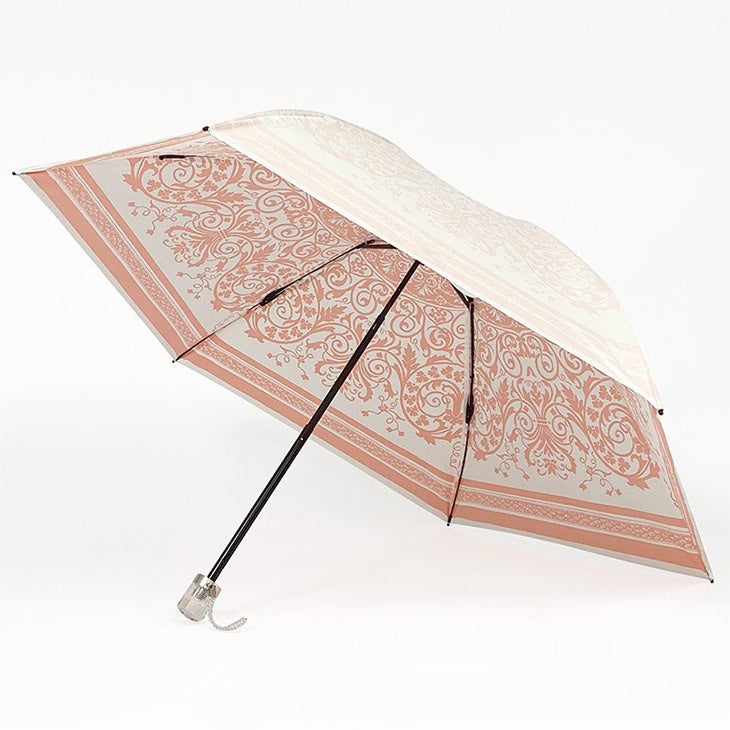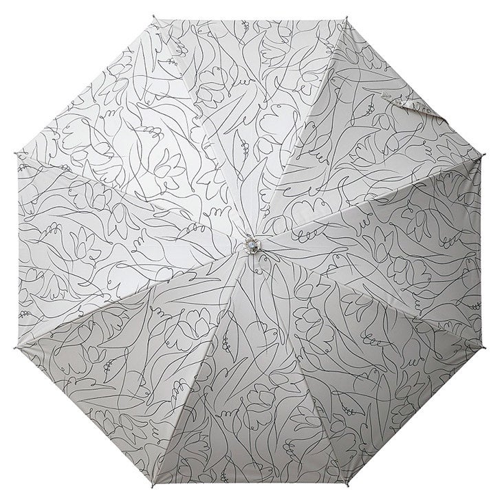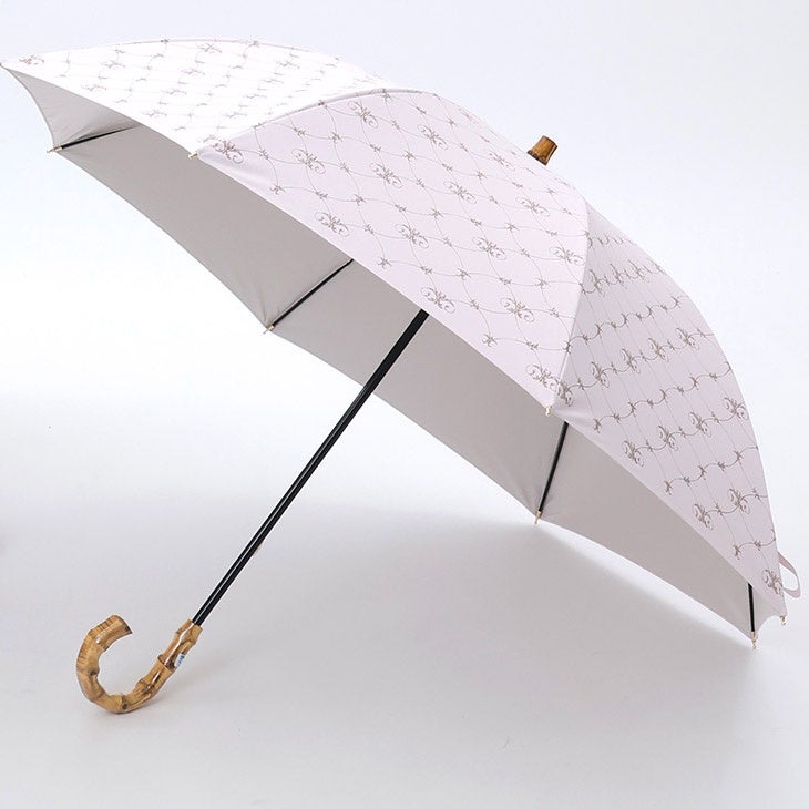 「プレミアムホワイト」は紫外線カット率99%以上、赤外線カット(遮熱)率98.5%と高性能。親骨には国産カーボンを使用し、軽量かつ耐久性に優れた日本製の晴雨兼用傘は、ボタニカルなダマスク柄でエレガントに。ロクロで開閉できる簡単開閉式で、ポーチ型の傘袋付きです。