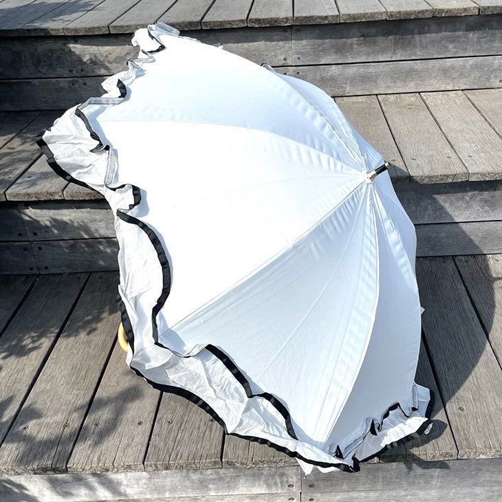 遮熱性に優れた一級遮光生地「東レ サマーシールド(R)」を使用した晴雨兼用傘。裾にパイピング加工のフリルを掛け合わせたデザインはカジュアルさと甘さの絶妙なバランスで、幅広いスタイルにマッチします。