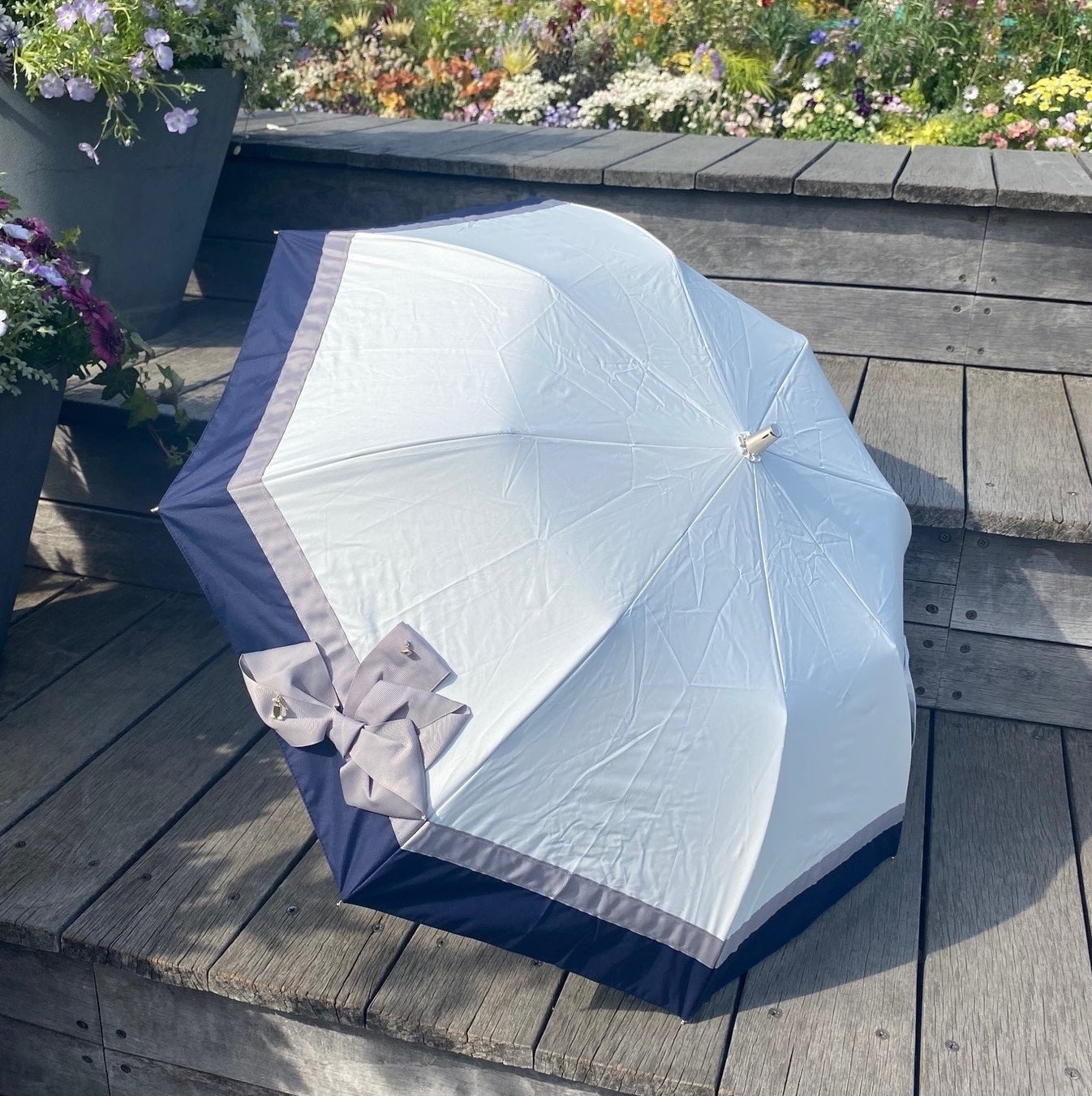 キラリと光るビジューがポイントのビジューリボンです。縁を上品な配色で囲んだ、派手すぎず上品な色合いでありながら、まるでプレゼントのような愛らしいデザイン。遮光・UV遮蔽・遮熱効果があり、突然の雨も安心な晴雨兼用仕様です。