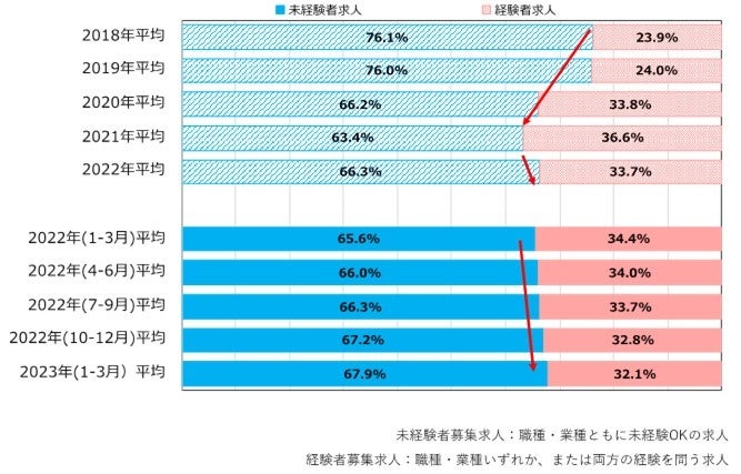 求人の募集比率は、未経験者求人が67.9%(2022年平均比1.6pt増)、経験者求人が32.1%。未経験者求人比率は2021年まで減少傾向にあったが、2022年では増加に転じた。人手不足感の高まりから、募集の条件を未経験にまで広げる企業が増加していることがわかる。【図3】