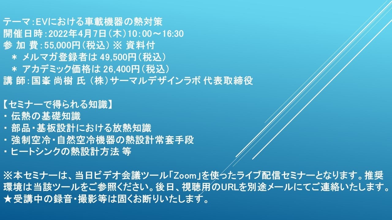 先端技術情報や市場情報を提供している(株)シーエムシー・リサーチ(千代田区神田錦町: https://cmcre.com/ )では、 各種材料・化学品などの市場動向・技術動向のセミナーや書籍発行を行っておりますが、 このたび「EVにおける車載機器の熱対策」と題するセミナーを、 講師に国峯 尚樹 氏 (株)サーマルデザインラボ 代表取締役)をお迎えし、2022年4月7日(木)10:00より、 ZOOMを利用したライブ配信で開催いたします。 受講料は、 一般:55,000円(税込)、 弊社メルマガ会員:49,500円(税込)、 アカデミック価格は26,400円(税込)となっております(資料付)。
