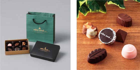 チョコレートは、本来の味が楽しめるショコラやトリュフ、ニコアンドのロゴグラフィック包装のスティックショコラ、クッキーなど、様々な組み合わせでお楽しみいただけます。