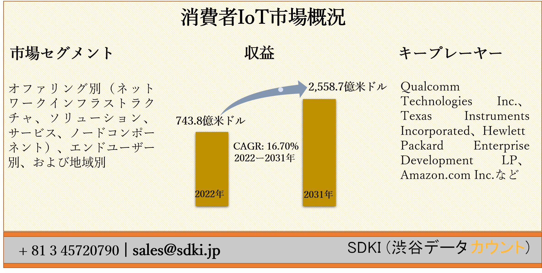 SDKI Inc.は、「消費者(コンシューマー)IoT市場ー世界予測2022ー2031年」新レポートを 2022年01月18日に発刊しました。この調査には、消費者IoT市場の成長に必要な統計的および分析的アプローチが含まれています。レポートで提供される主要な産業の洞察は、市場の既存のシナリオに関する読者に市場の概要についてのより良いアイデアを提供します。さらに、レポートには、市場の成長に関連する現在および将来の市場動向に関する詳細な議論が含まれています。