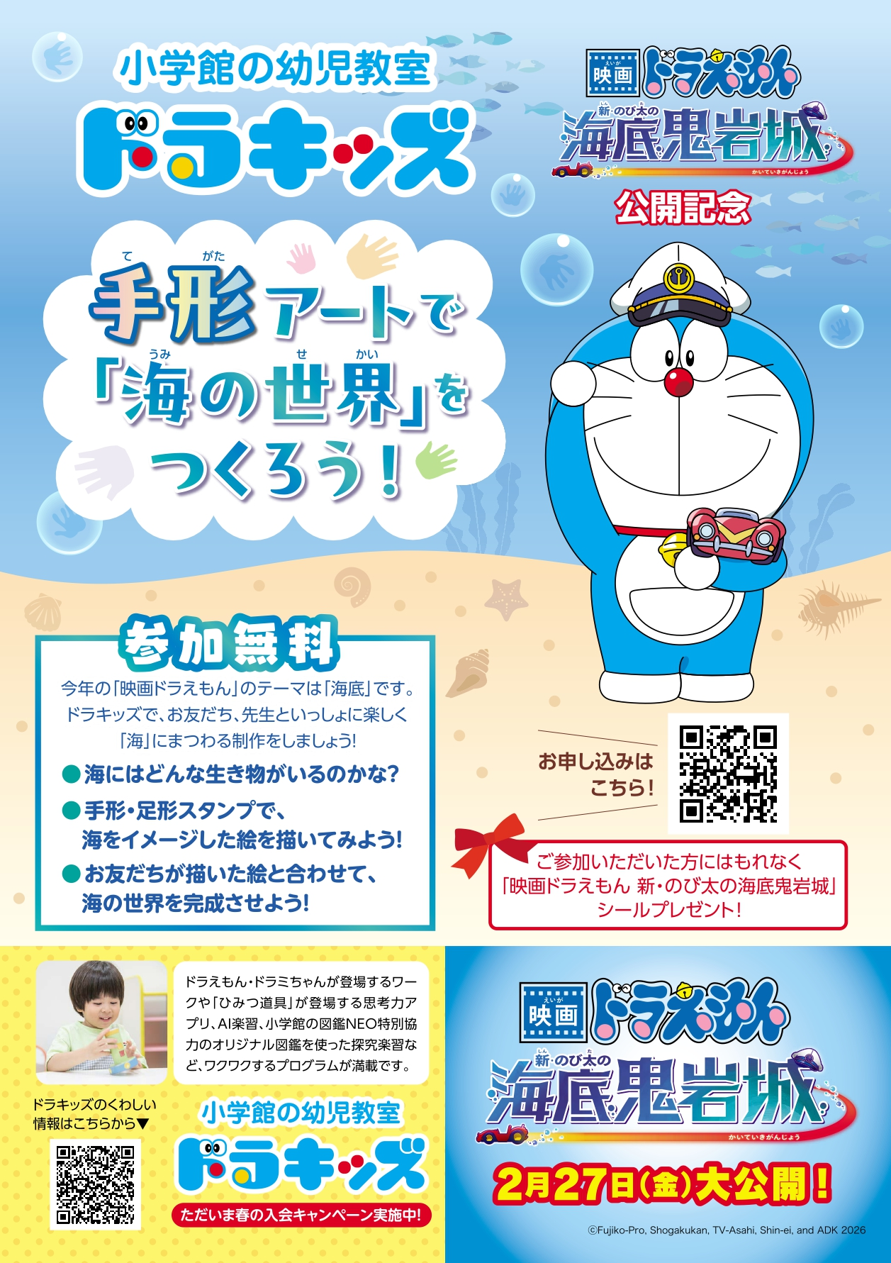 株式会社小学館集英社プロダクション(本社:東京都千代田区、代表取締役社長:松井 聡、以下:ShoPro)が運営する、小学館の幼児教室「ドラキッズ」では、2026年2月より『映画ドラえもん 新・のび太の海底鬼岩城』(2月27日(金)公開)の公開を記念して「ドラキッズ 手形アートで『海の世界』をつくろう!」を開催いたします。