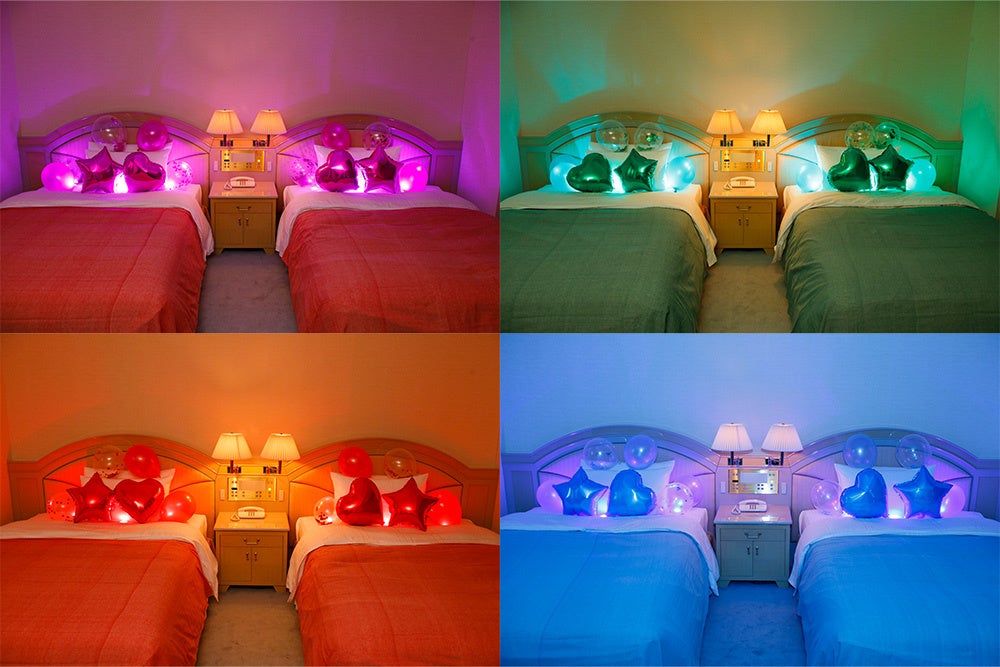 ホテルからはバルーン、置き型LEDライト(6個セット)をご用意。もちろん、お客さまが思い思いの推しアイテムを持ち込んで室内をアレンジするのも自由です。※バルーンは赤、青(水色)、黄(イエローゴールド)、緑、紫、ピンク、白、黒より希望の色をお選びいただけます。置き型LEDライトはリモコンで12色の中から自由に変更可能です。