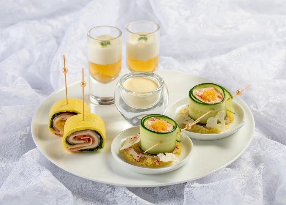 セイボリーには、じゃがいもの冷製スープや 蟹のタルタルなど、白を基調に見た目も美しく仕上げたメニューがラインアップ。また、ドリンクの種類もさらに豊富になり、アフタヌーンティーでのみご注文いただけるフレーバーティーを含む、全15種の紅茶やコーヒーなどをご用意いたします。