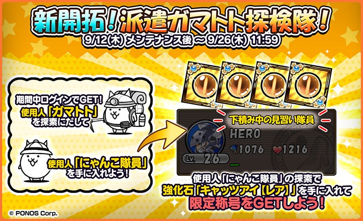 使用人「ガマトト」を探索に出すと、使用人「にゃんこ隊員」をゲットするチャンスがアップします。使用人「にゃんこ隊員」は、探索で強化石「キャッツアイ【レア】」を拾ってくることがあり、探索時間が長いほど手に入れやすくなります。また、強化石の獲得数に応じて、期間限定の称号を受け取ることができます。