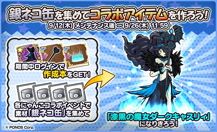 『にゃんこ大戦争』コラボイベントで獲得できる素材「銀ネコ缶」を集めて、「漆黒の魔女ダークキャスリィ」になりきれるコラボアイテムを作成しましょう。作成本「ダークキャスリィの呪いの本」「ダークキャスリィの杖の本」「ダークキャスリィコスの本」は、「お知らせ」画面から受け取ることができます。