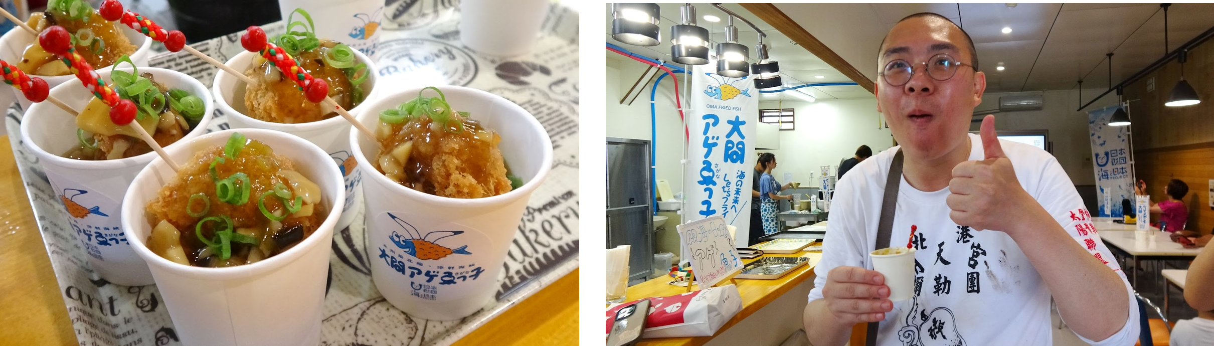 17日の本祭では、シェアキッチンすてっぷにてアゲ魚っ子ボールを300食準備しました。その内、100食限定で「台湾風あんかけソース」をかけた特別なアレンジでふるまいました。実は大間稲荷神社には、台湾の海神様「天妃様」もお祀りされており、毎年大間の海の日には「天妃様行列」という、台湾文化の色濃い行列が行われるのです。そこで、料理家・栗原心平さんが考案してくれたレシピを参考に、台湾で使われる香辛料「八角」を利かせたあんかけボールに。祭りへ見学に来た地元の子どもたちや観光のお客さんなど、美味しそうに食べて頂きました。