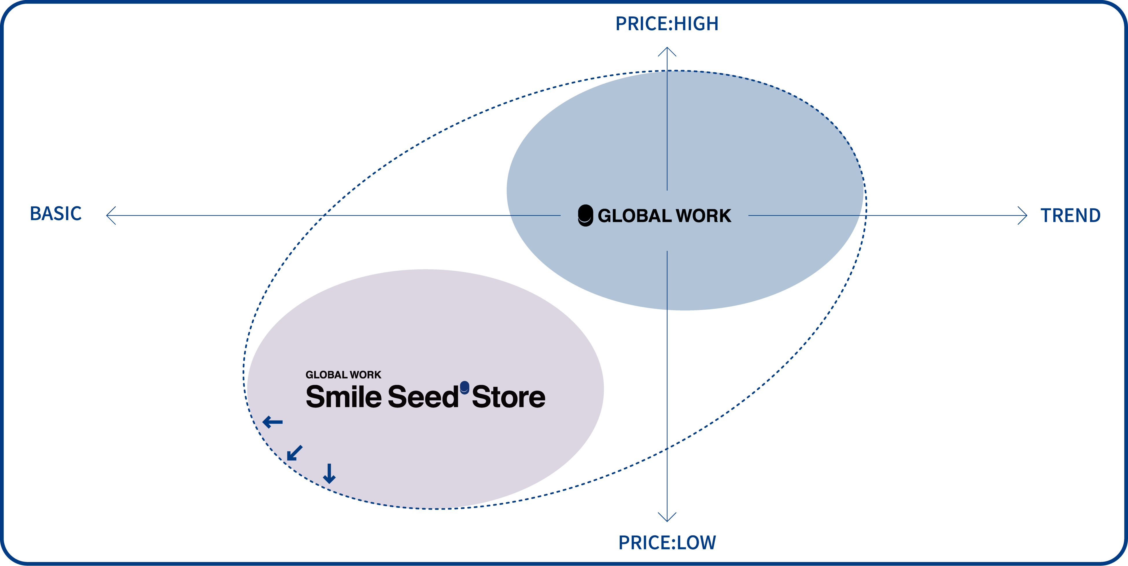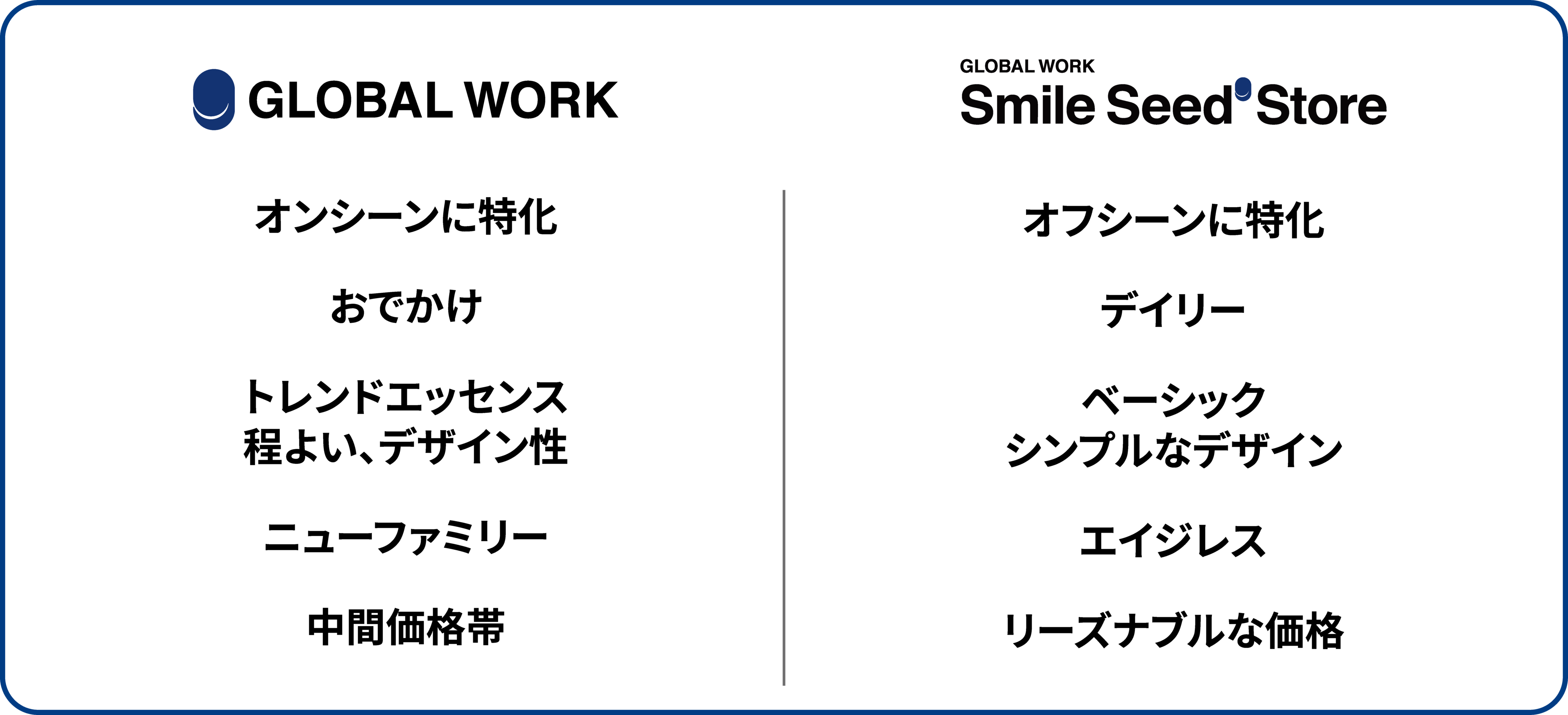 これまで、グローバルワークではオンシーンやトレンド要素を盛り込んだ商品がご好評をいただいてきました。スマイルシードストアでは、よりベーシックでシンプルなデザインのアイテムで、日常に寄り添い、生活に根ざしたラインアップで新しいチャネルへの拡充を狙います。