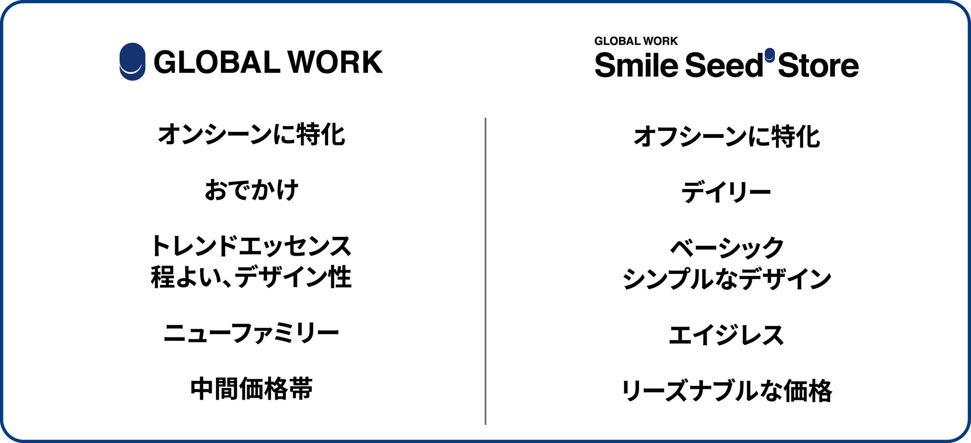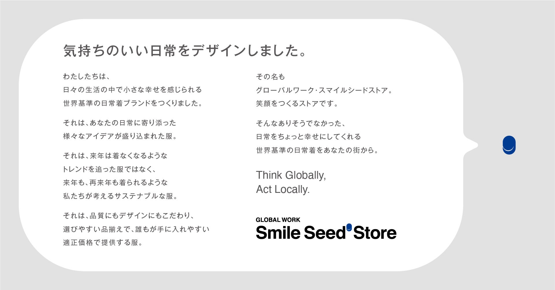 昨今のお客さまの価値観・生活様式の変化に伴い、アパレル市場の変化は加速しました。新しい豊かさを提案していくブランドが求められつつあります。年代を問わず、身近な地域とのつながり、日常の大切さを感じる暮らしの需要の高まりを受けて、これまでニューファミリー層のオンシーンを中心に展開してきたグローバルワークが、よりデイリーニーズに特化したファッションを提案する新業態「スマイルシードストア」を手掛けます。