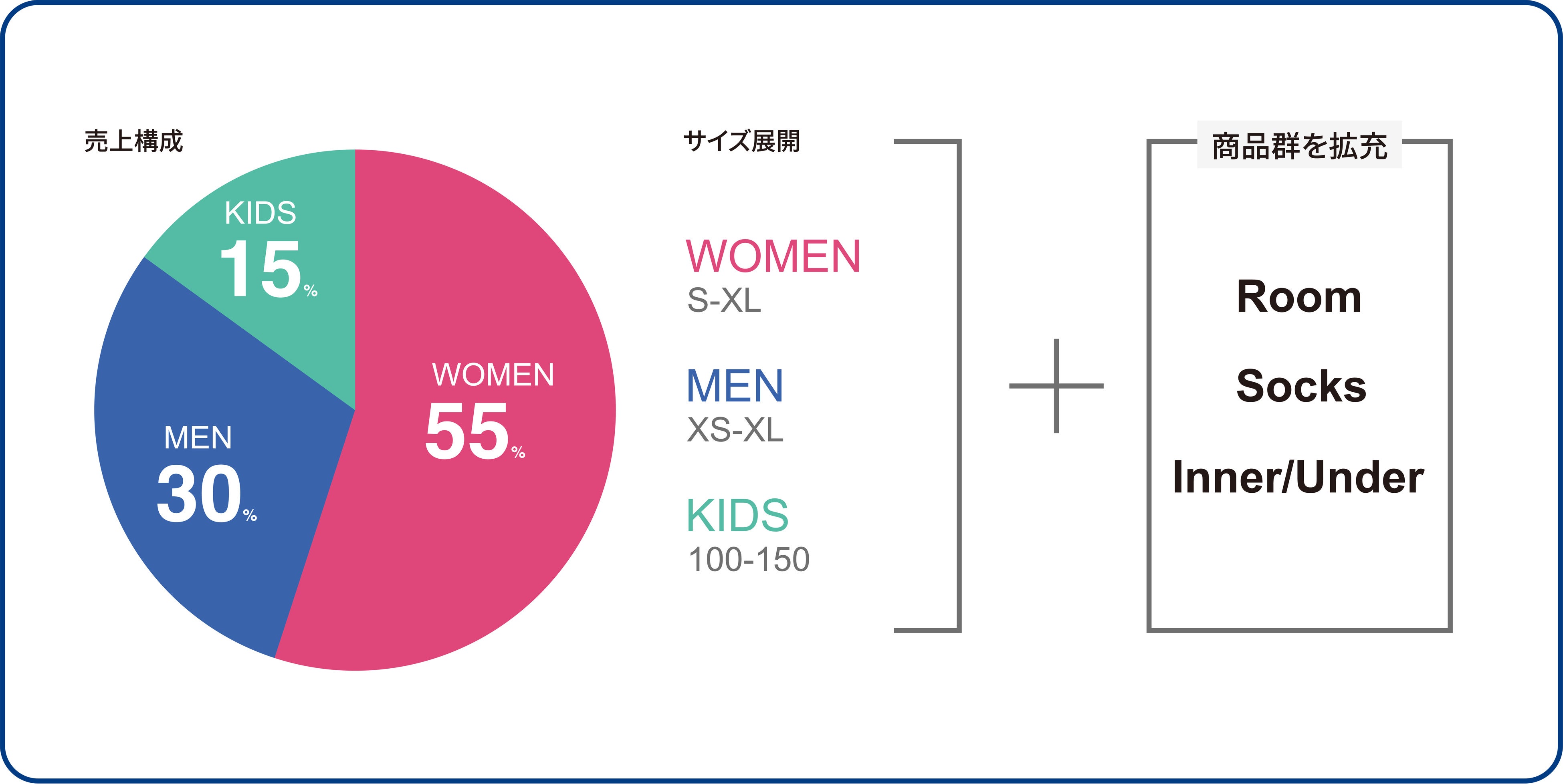 また、グローバルワークが得意とする20~30代の女性・男性とお子様を中心に、インナーやROOMなどのカテゴリーを拡充し、幅広いラインアップを提供します。
