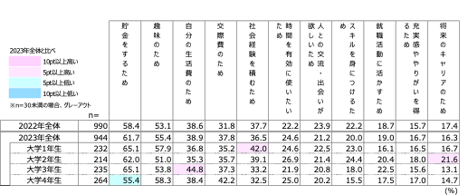アルバイトの目的は「交際費のため」が6.0pt増加。低学年層ほどキャリア形成を目的とする傾向も【図1、2】