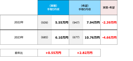 手取りの月収平均は6.10万円(前年比+0.55万円)。一方で、希望月収は10.76万円(前年比+2.82万円増)となり、4.66万円の大幅なギャップ【図5】