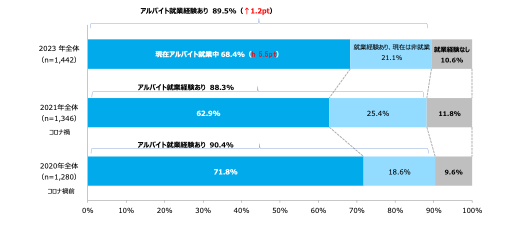 現在アルバイト就業中の大学生の割合は68.4%。コロナ禍前に実施した2020年調査の水準には回復していないが、コロナ禍がはじまった2021年より5.5pt増加した。【図1】