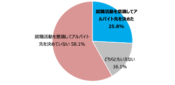アルバイトの目的は「交際費のため」が前年より大きく増加。就活を意識してアルバイト先を決めた割合は25.8%。「将来に役立つ経験ができる」「将来についてアルバイト先で話ができる」ことを重要視する傾向