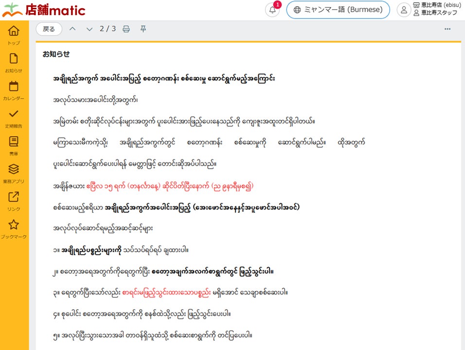 本部から配信された従業員向けの文書をAIで翻訳。ベトナム語、インドネシア語、ミャンマー語など、14ヶ国語に対応し、外国人スタッフの母国語で表示されることで、本部からの指示などに迅速に対応可能。