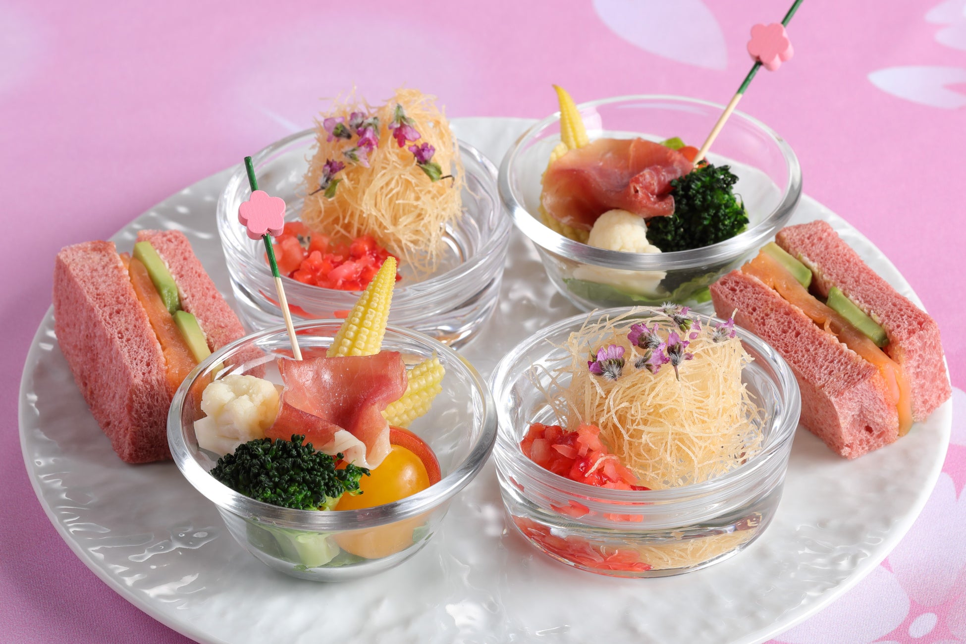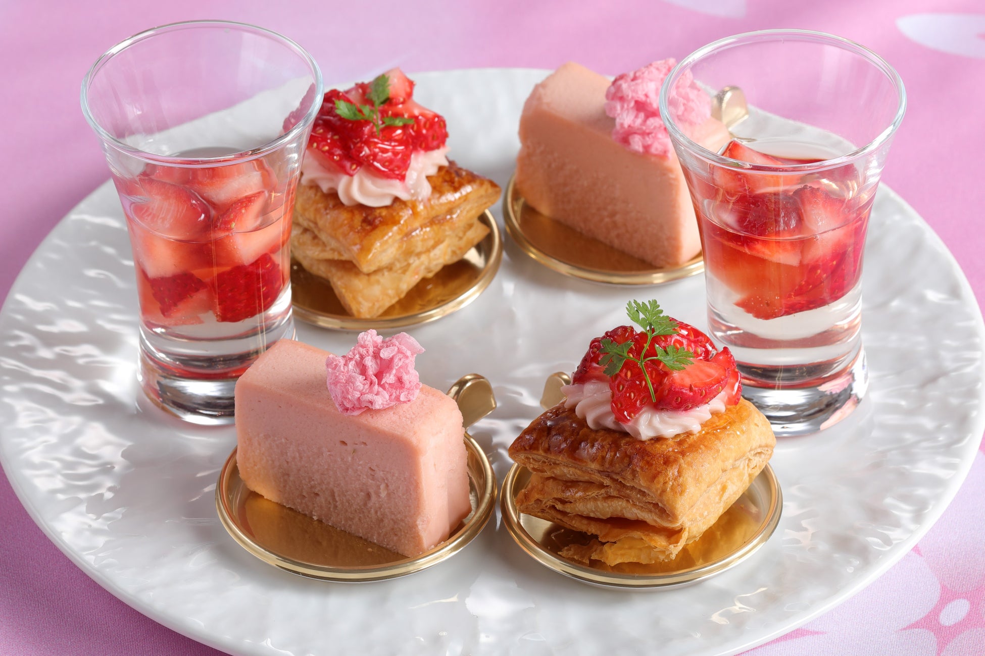 旬のいちごに桜のエッセンスや抹茶など、和のテイストをプラスしたアフタヌーンティー。抹茶や粒あんを使用した桜のブラン・マンジェや桜餅をイメージしたオムレット、鮮やかなベリーのソースでお召し上がりいただく生ハムのサラダなど、春を感じる桜色のスイーツとセイボリーをお楽しみください。