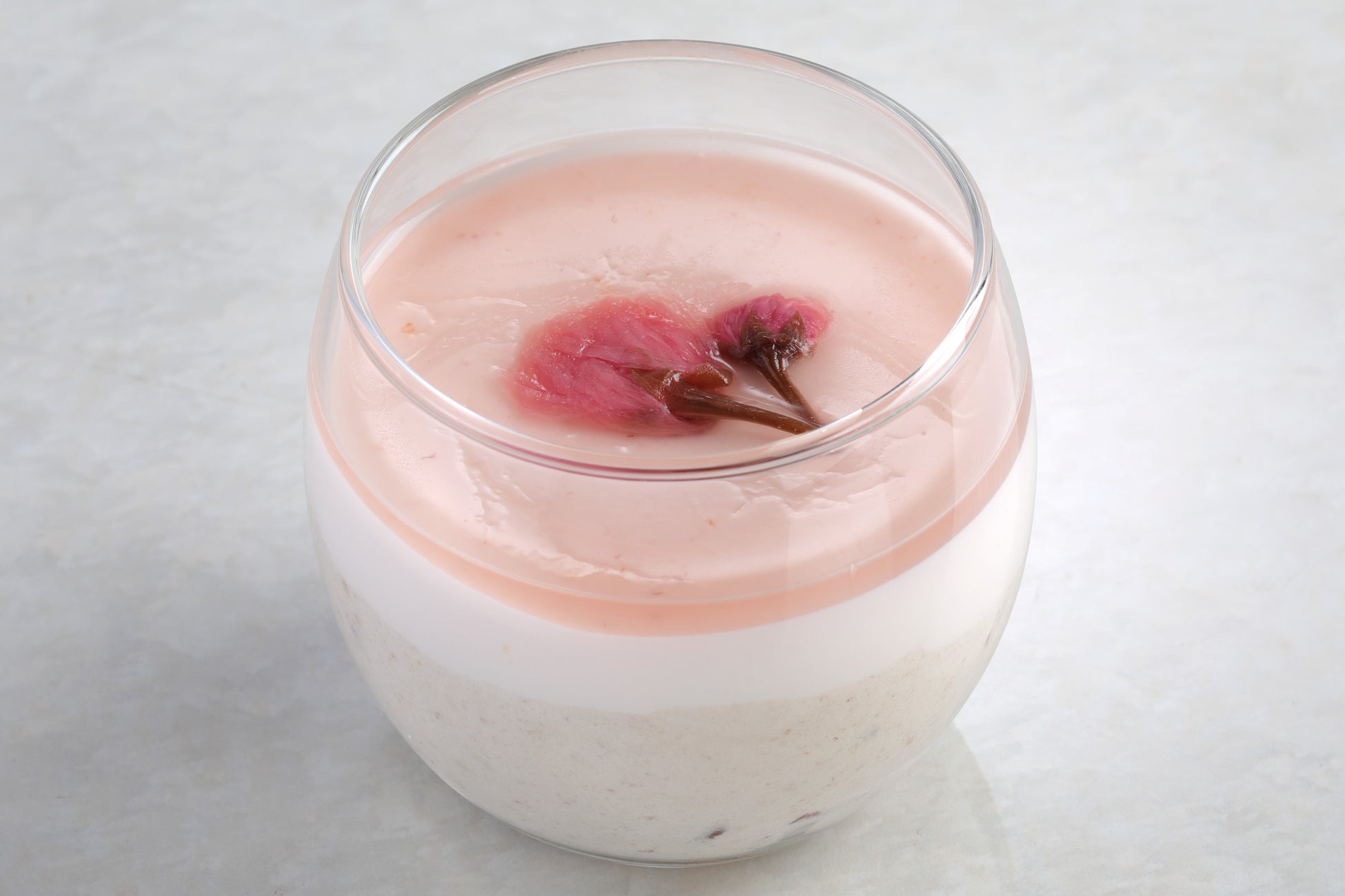 小倉あんの甘みと塩漬けした桜の花のほのかな塩味が絶妙な、日本茶との相性も良い和テイストのブラン・マンジェ。小倉あんのムース、桜のブラン・マンジェ、いちごのジュレを層にし、桜の花の塩漬けをトッピングしました。