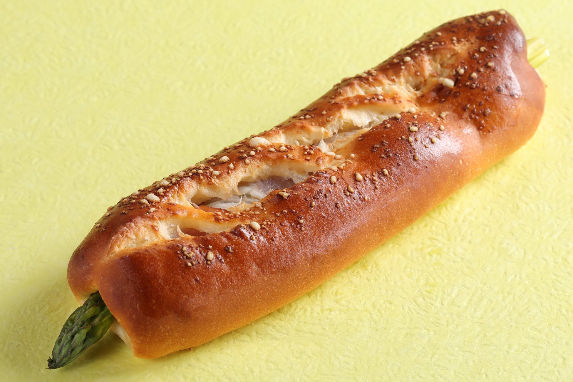 バター風味のパン生地にベシャメルソースを塗り、ベーコンを巻いたグリーンアスパラガスを入れて焼き上げた、春を感じる惣菜パン。朝食やお酒のおつまみとしてもおすすめです。