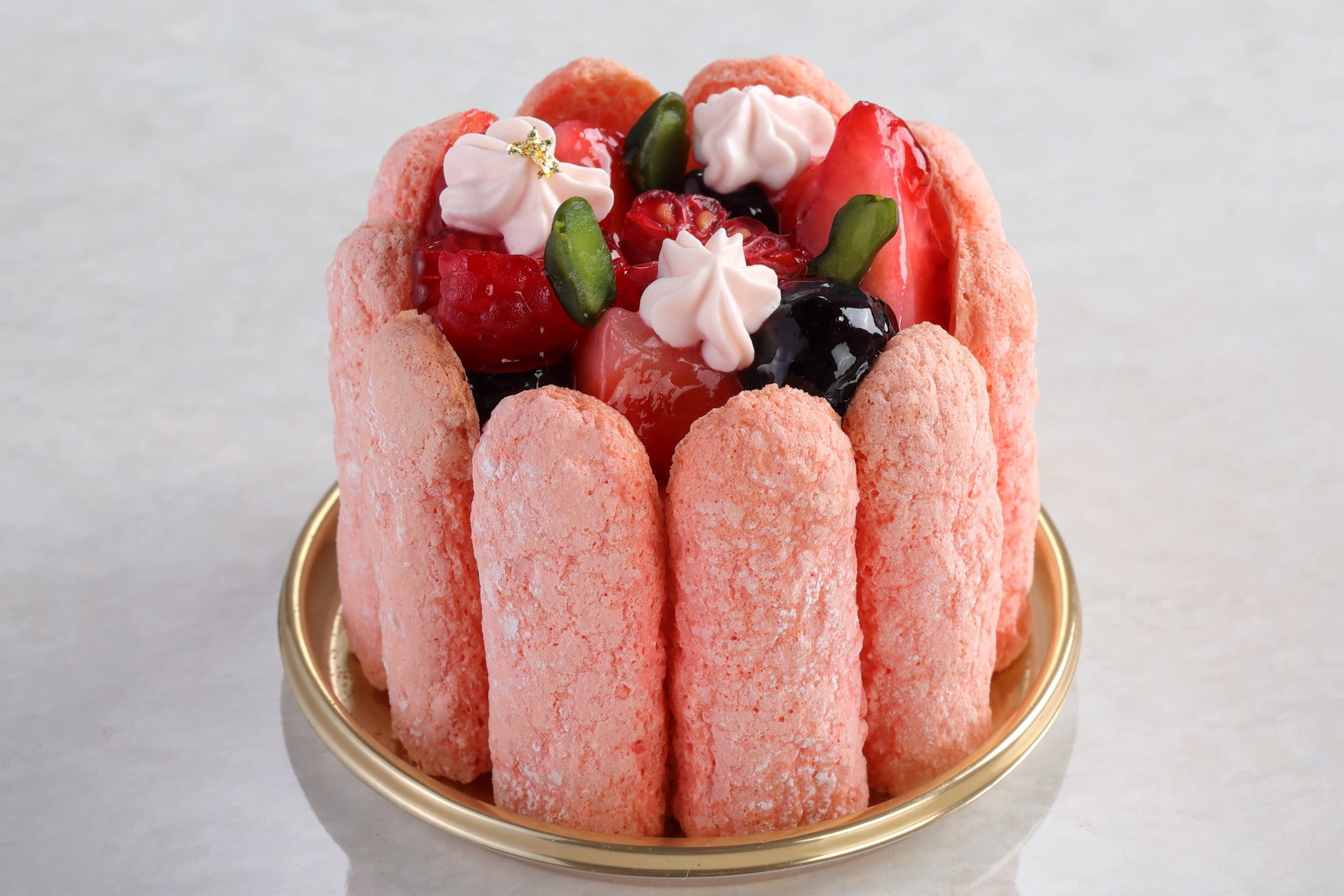 チェリーのコンポートとムースをビスキュイ生地で包み、3種類のベリーと桜風味のクリームを飾りました。甘酸っぱいベリーとチェリーに桜のほのかな香りが加わった、見た目も華やかなピンク色のシャルロットです。