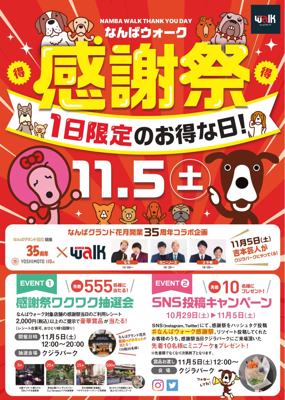 なんばウォーク感謝祭で行われる感謝祭ワクワク抽選会ではなんばグランド花月ペアチケットがあたるチャンスが!さらに抽選会に吉本芸人が登場し、盛り上げます!