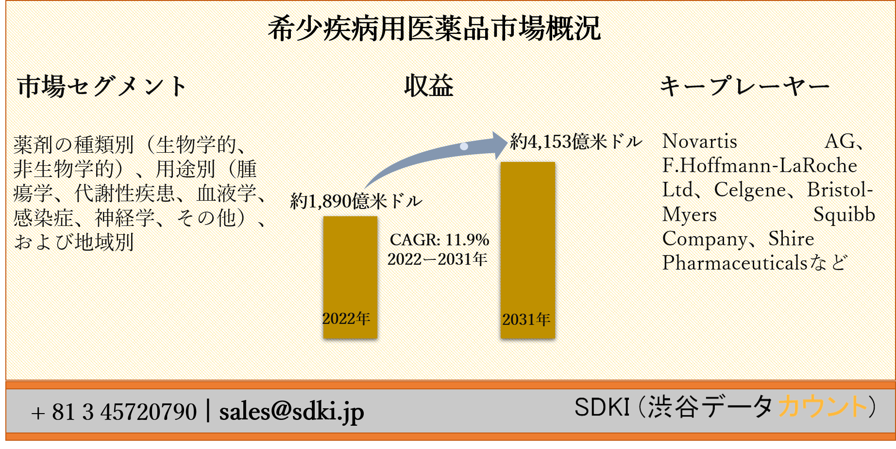 SDKI Inc.が「世界の希少疾病用医薬品市場ー予測2022ー2031年」の新調査レポートを2022年01月18日に発刊しました。レポートは、業界の新ビジネスチャンスとともに、市場とその成長見通しの完全な評価を提供します。さらに、2022ー2031年の予測期間中の市場規模と年間成長率が含まれています。