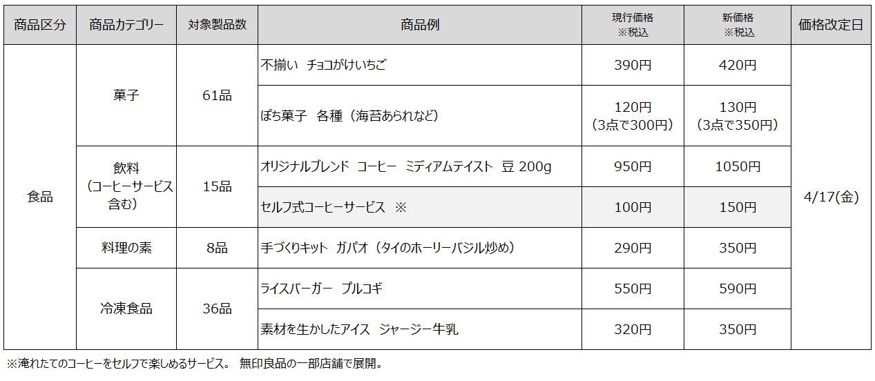 無印良品を展開する株式会社良品計画(東京都文京区/代表取締役社長 清水 智)は、4月17日(金)より、菓子を中心とした食品118品目、および一部店舗で展開しているセルフ式コーヒーサービスについて価格改定(値上げ)を実施します。