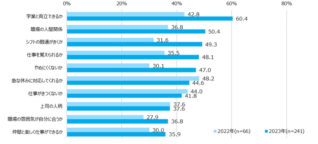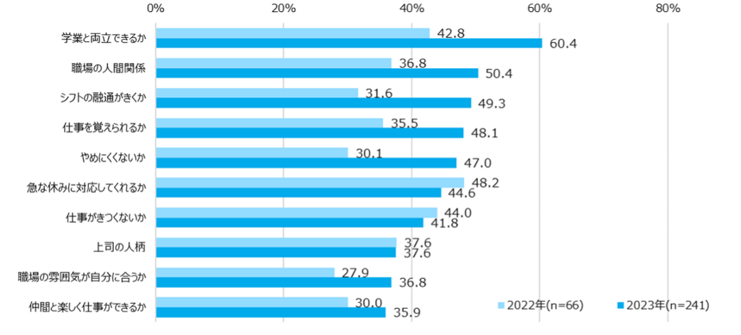 新しくアルバイトを始める際に不安に感じることは、「学業と両立できるか」 が60.4%と最も高く、次いで「職場の人間関係」が50.4%、「シフトの融通がきくか」が49.3%となった。前年比では「シフトの融通がきくか」が+17.7ptと大きく増加した。コロナ禍から平時対応へ戻りつつある中で、これまで制限されていた学校行事や部活動、友人との交際などでこれまでより忙しくなることが予想されるため、柔軟に働けるか不安に感じる学生が増えたことにより、先述の希望職種の変化にも影響していると考えられる。【図6】