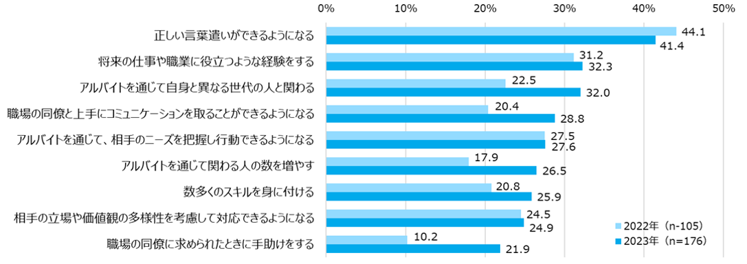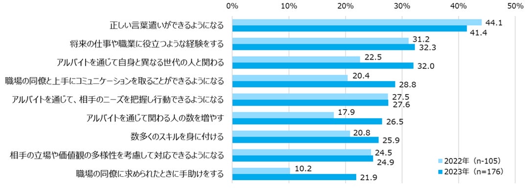 就職活動を意識してアルバイトをしている高校生は29.7%となった。アルバイトをする上で意識していることは、「正しい言葉遣いができるようになる」が41.4%と最も高く、次いで「将来の仕事や職業に役立つような経験をする」が32.3%、「アルバイトを通じて 自身と異なる世代の人と関わる」が32.0%、「職場の同僚と上手にコミュニケーションを取ることができるようになる」が28.8%となった。前年と比べると、「職場の同僚に求められたときに手助けをする」が+11.7ptと最も増加し、次いで「アルバイトを通じて自身と異なる世代の人と関わる」が+9.5pt、「アルバイトを通じて関わる人の数を増やす」が+8.6pt、「職場の同僚と上手にコミュニケーションを取ることができるようになる」が+8.4ptで、様々な立場や世代の人とのコミュニケーションに関する項目が総じて上位となった。これまでコロナ禍により制限されてきたコミュニケーションをアルバイト先で意識的に実践しようとする高校生が多いことがわかる。【図3、4】