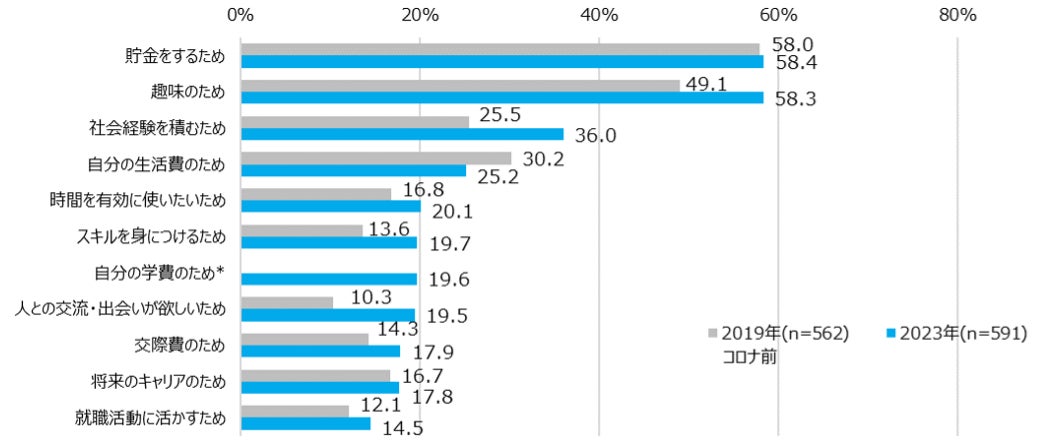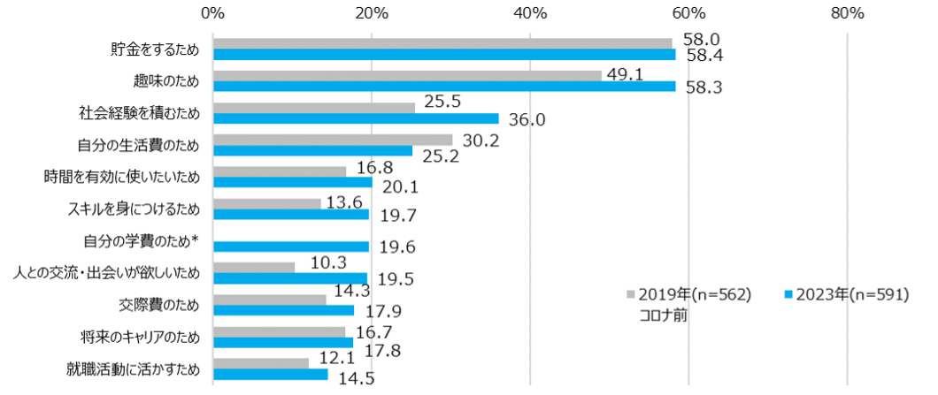 ※ベース:現在アルバイト就業中、「自分の学費のため」は2019年非聴取選択肢