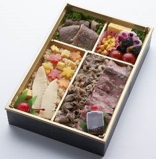 牛肉料理で誰もが思い浮かぶステーキ・焼肉・すき焼を入れた見た目にも楽しく彩りよく贅沢なお弁当です。