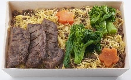 仙台名産の牛たん焼と甘辛く味付けした牛たんそぼろをちらしにしました。菜の花や花人参で春の訪れを表現。