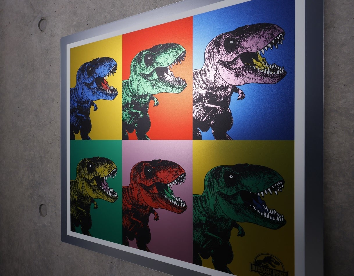 ポップアート風なモダンな作品。今まで見たことのないハイセンスなコレクターズアイテムに。『ジュラシック・ワールド』シリーズ シルバーアート全4種各¥62,700(税込) 3Dアート全2種各¥49,500(税込)