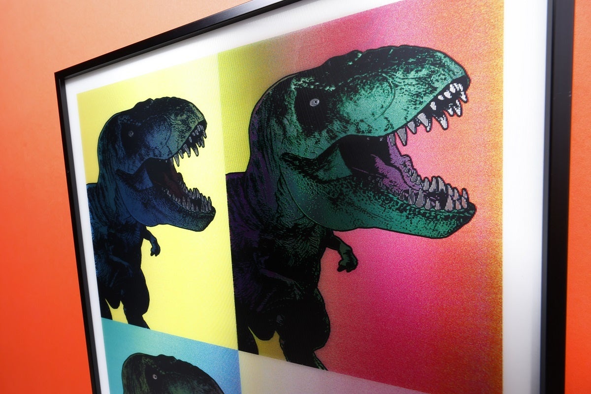 シルバーアートは、銀地(シルバーペーパー)に高性能UVインクジュエットで印刷を施し、背面をアルミフレームで仕上げた豪華版。シルバーペーパーの特徴は、光沢感があって、全面が銀色にキラキラと輝くこれまでにない存在感。そのまま飾ることができるハイセンスなコレクターズアイテムとなりました。3Dアートは印刷にレンチキュラーレンズを採用。見る角度によって色が変化したり、立体感が出たりと遊び心たっぷりに仕上げました。シリーズの中でも人気を誇るスター恐竜たちが揃った豪華ラインナップ。作品はシルバーアート4種、3Dアート2種の全6種。あなたのコレクションに加えてはいかがでしょう。
