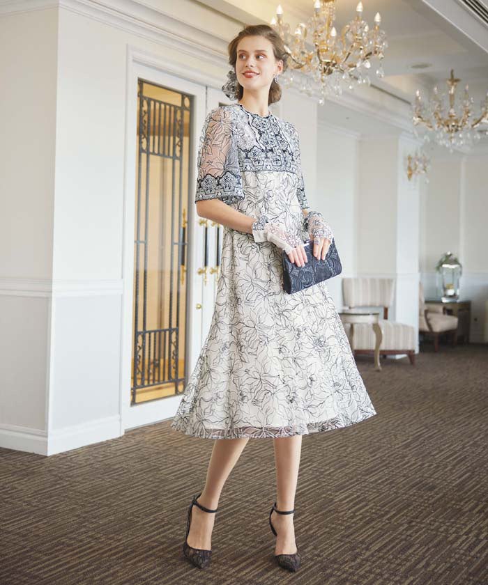 高級レストランや美術館などには、繊細なレースが存在感 を際立たせるドラマティックな一着を。レースのグローブで指先までレディに。 「ロッサ」 ワンピース135,000円 / グローブ 18,700円 【5階 婦人服】