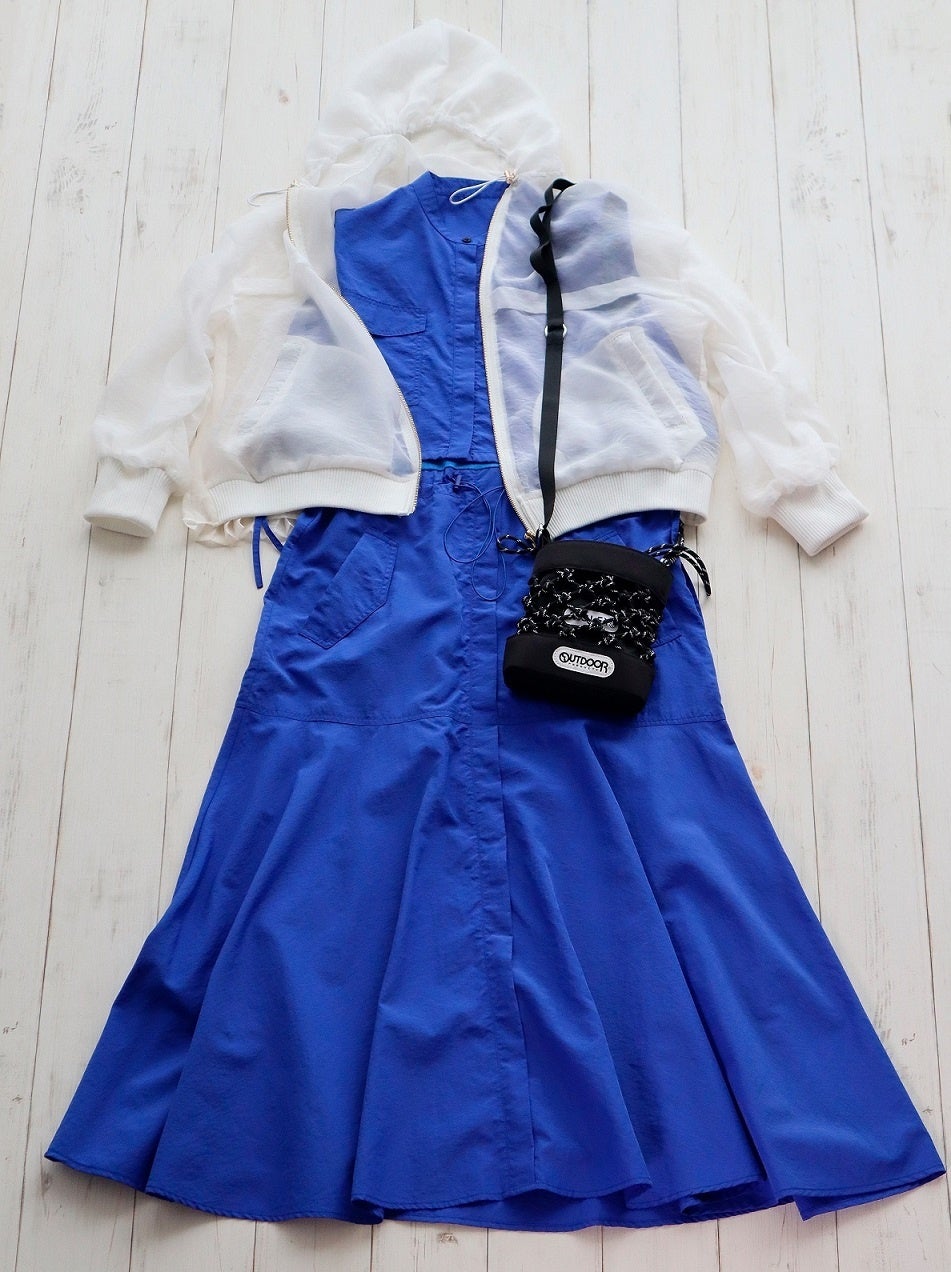 真っ青なワンピースに、シアーなブルゾンを重ねた透け感コーデが涼しげ!ロープをあしらったバッグで、アクティブな印象に仕上げて。