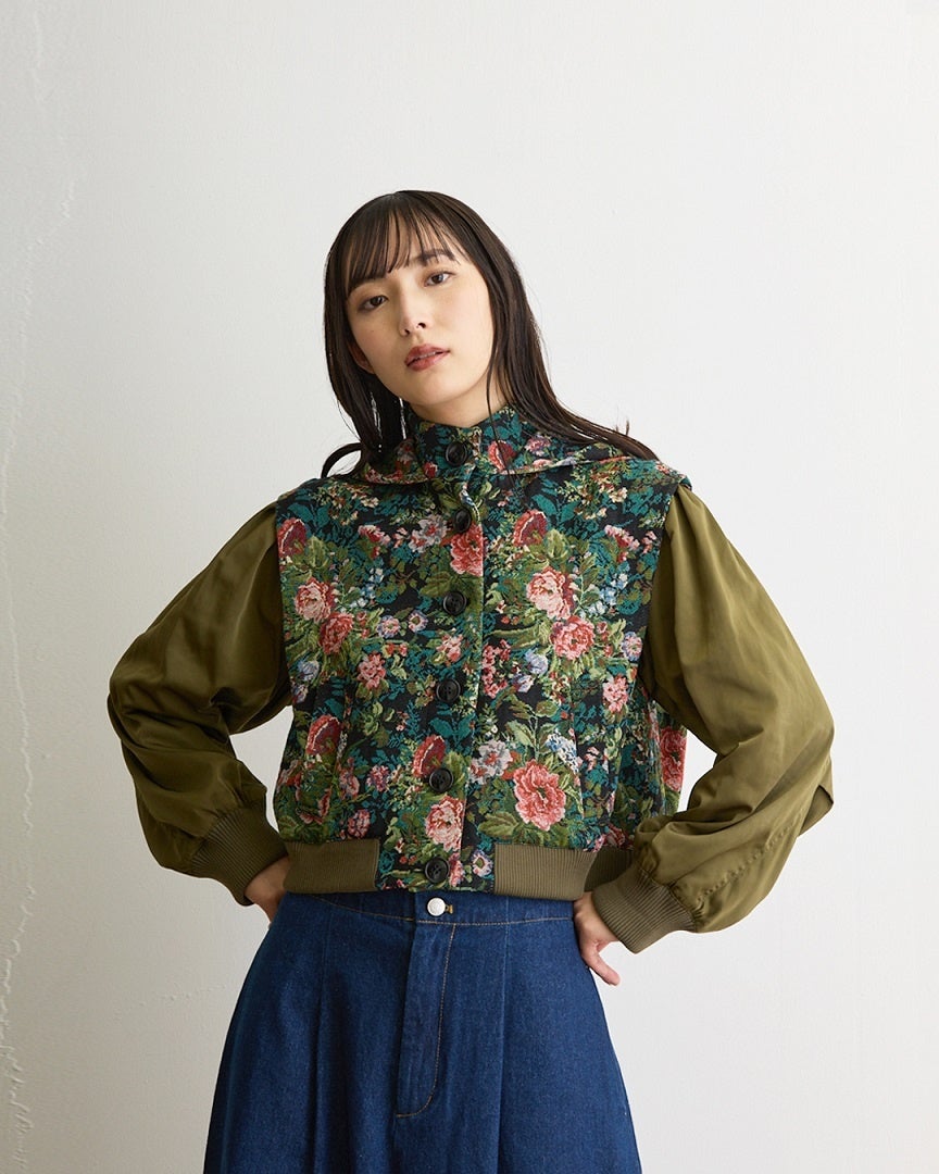 花柄のゴブラン織りの身頃にタフタ素材の袖を組み合わせた、パッと目を引くドッキングデザイン。大人っぽい華やかさがパリの街になじむ一着。