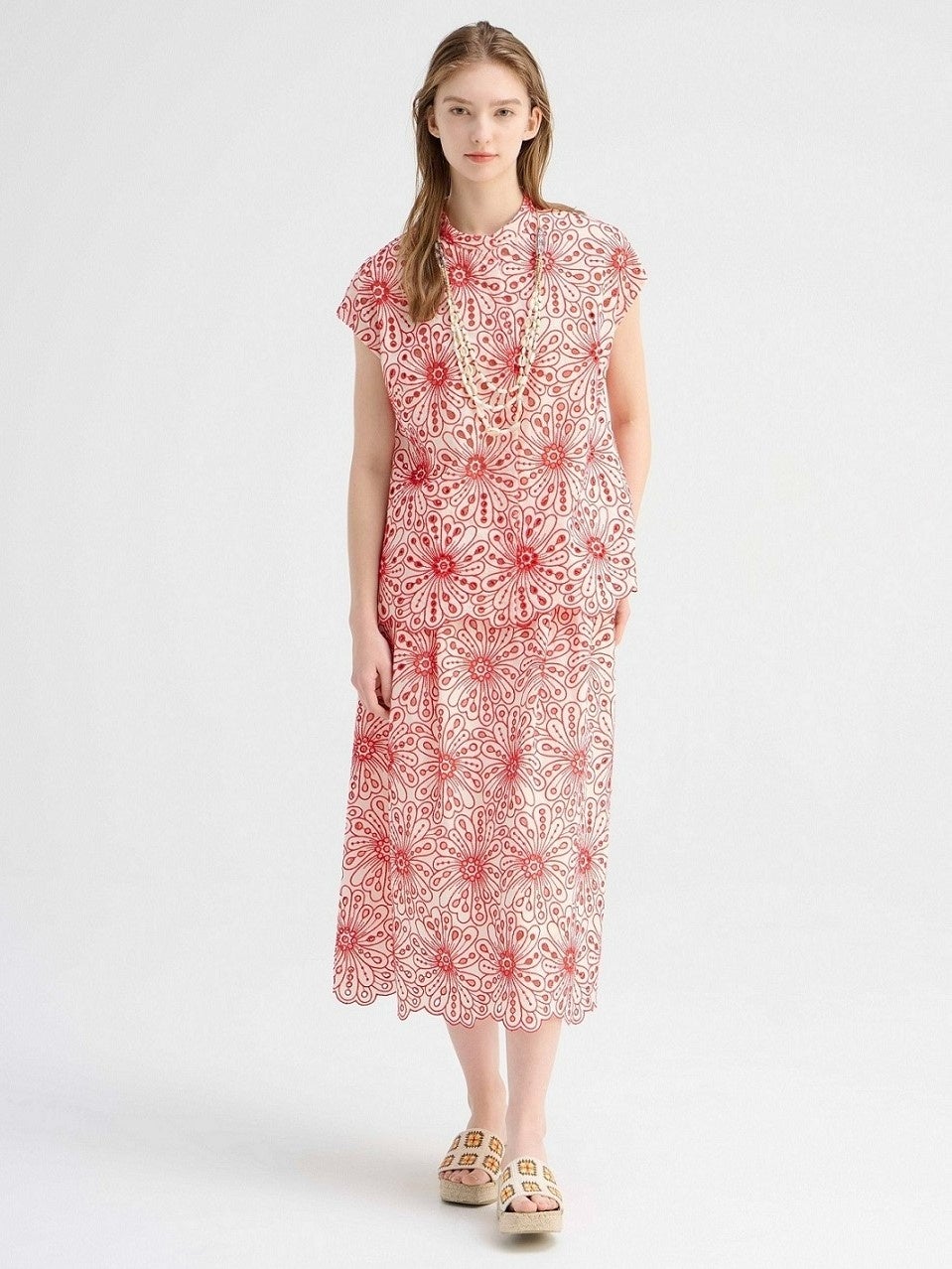大胆なフラワー柄のカットワーク刺しゅうを施した鮮やかなセットアップは、ホテルのカフェやレストランで過ごす時間を上品かつ華やかに。ソフトなコットン生地で着心地のよさも魅力。